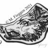 Illustration of the hallmark of a rooster’s head to the left with its beak open surrounded by a border